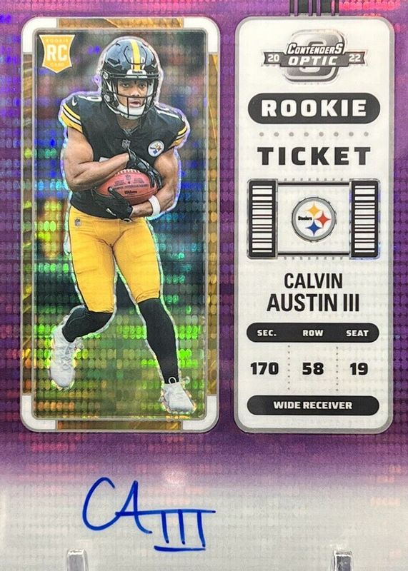 The Calvin Austin III 2022 Contenders Optic #107 Rookie Ticket Auto - Purple Pulsar /21 card in Raw condition has not changed in price in the last 30 days and was last sold for $59.99 .