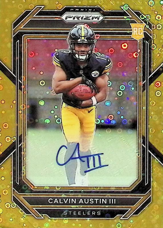 The Calvin Austin III 2022 Prizm #338 Rookie Autographs - No Huddle Gold /10 card in Raw condition has not changed in price in the last 30 days and was last sold for $61.00 .