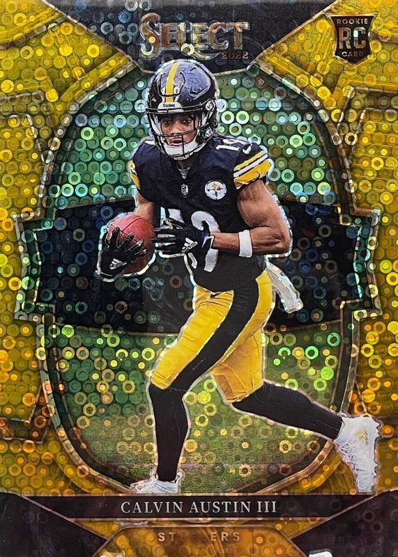 This card is 1 of 41 Calvin Austin III's card variations in the 2022 Select set being tracked by Sports Card Investor, including Concourse, Concourse Black & Green Die-Cut, Concourse Black & Red Die-Cut, Concourse Disco, and Concourse Green & Yellow Die-Cut.