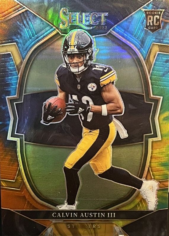 This card is 1 of 41 Calvin Austin III's card variations in the 2022 Select set being tracked by Sports Card Investor, including Concourse, Concourse Black & Green Die-Cut, Concourse Black & Red Die-Cut, Concourse Disco, and Concourse Green & Yellow Die-Cut.