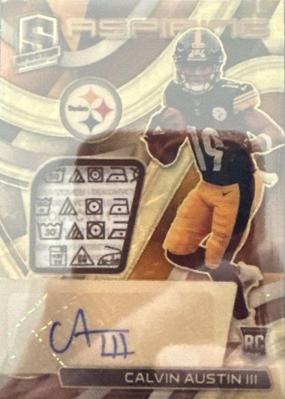 The Calvin Austin III 2022 Spectra #APA-CAU Aspiring Patch Autographs - Gold /1 Rookie card in Raw condition has not changed in price in the last 30 days and was last sold for $227.50 .