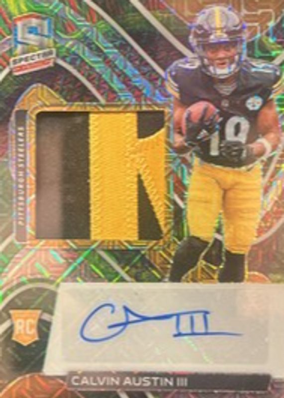 The Calvin Austin III 2022 Spectra #240 Rookie Patch Auto - Meta /10 card in Raw condition has not changed in price in the last 30 days and was last sold for $35.00 .
