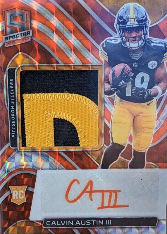 The Calvin Austin III 2022 Spectra #240 Rookie Patch Auto - Neon Orange /15 card in Raw condition has not changed in price in the last 30 days and was last sold for $22.50 .