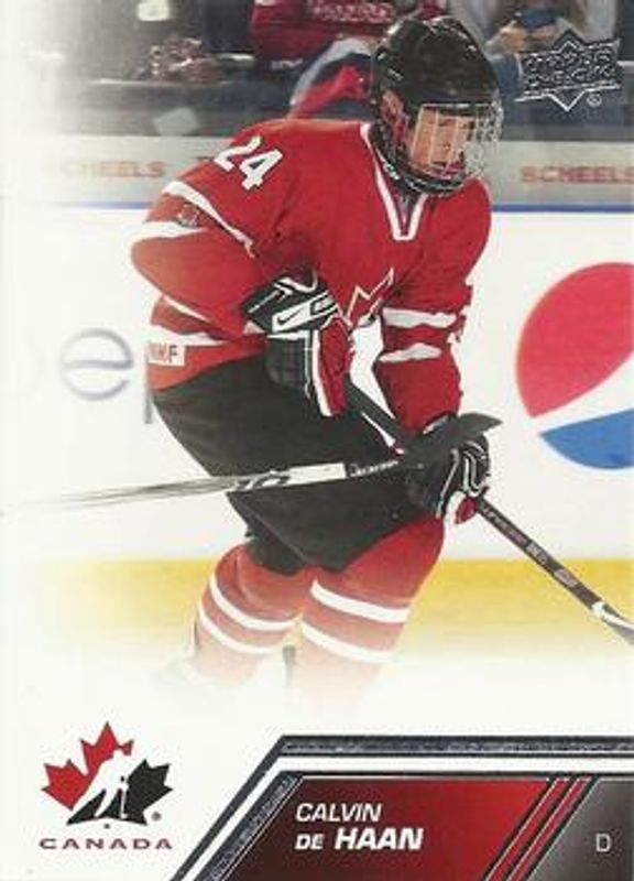 The Calvin de Haan 2013 Upper Deck Team Canada #23 Base card is 1 of 9 Calvin de Haan's card variations in the 2013 Upper Deck Team Canada set being tracked by Sports Card Investor, including Gold Signatures, Exclusive Red /100, High Gloss Gold /10, Black Signatures /5, and Printing Plates Black /1.