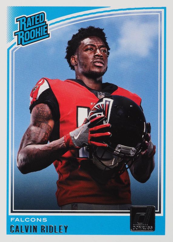This card is 1 of 46 Calvin Ridley's card variations in the 2018 Donruss set being tracked by Sports Card Investor, including Base, Jersey Number (/18), Press Proof Blue, Press Proof Green, and Press Proof Red.