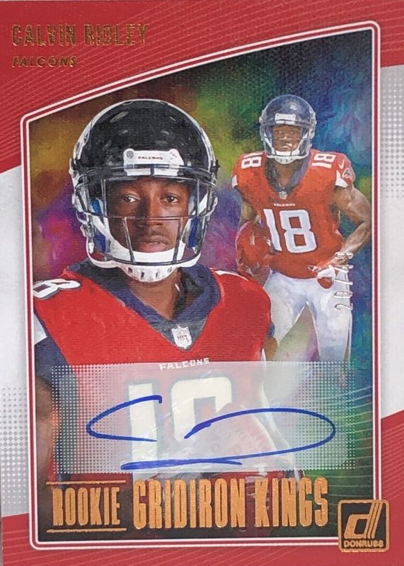 The Calvin Ridley 2018 Donruss #RGK-11 Rookie Gridiron Kings Autographs (/49) card in Raw condition has not changed in price in the last 30 days and was last sold for $20.50 .