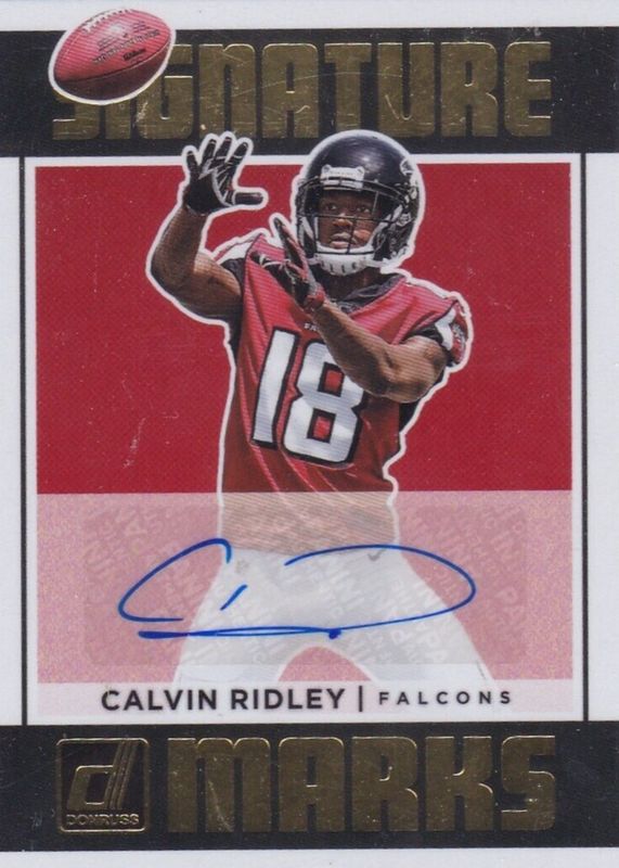 The Calvin Ridley 2018 Donruss #SM-CR Signature Marks Rookie card in Raw condition has not changed in price in the last 30 days and was last sold for $8.00 .