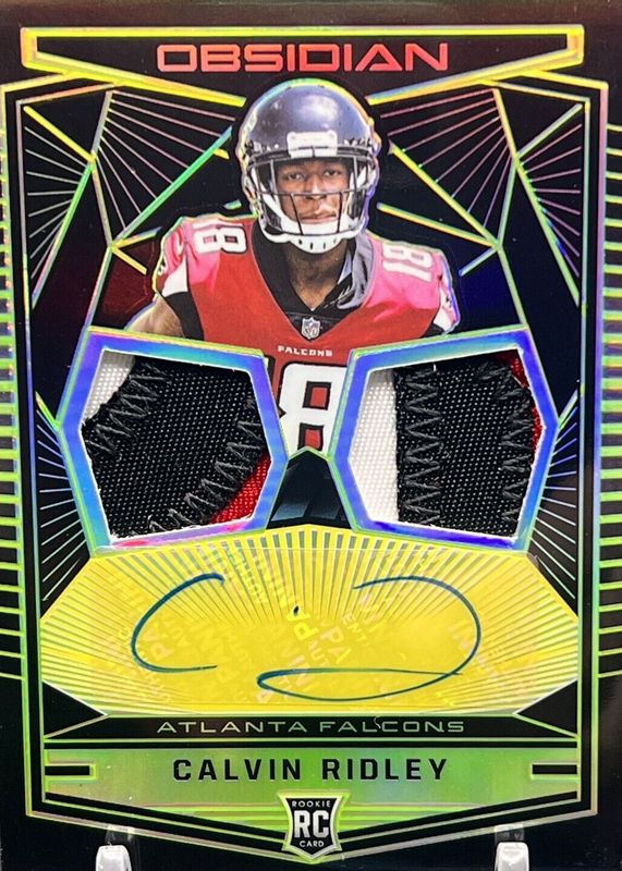 The Calvin Ridley 2018 Obsidian #RJ-CR Rookie Jersey Autographs - Electric Etch Yellow /10 card in Raw condition has not changed in price in the last 30 days and was last sold for $37.00 .