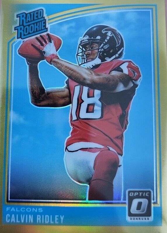 The Calvin Ridley 2018 Optic #161 Gold /10 Rookie card in Raw condition has not changed in price in the last 30 days and was last sold for $56.00 .