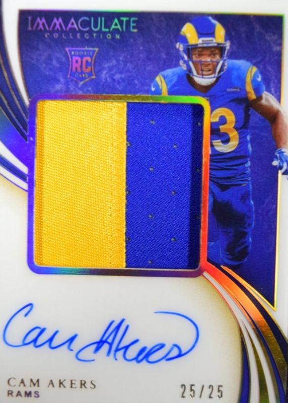 This card is 1 of 25 Cam Akers' card variations in the 2020 Immaculate set being tracked by Sports Card Investor, including Immaculate Numbers Rookie Patch Autographs (/23), Immaculate Rookie Eye Black Jersey Autographs (/99), Immaculate Rookie Shadowbox Signatures (/99), Immaculate Rookie Signature Patches (/99), and Premium Patch Rookie Autographs (/99).