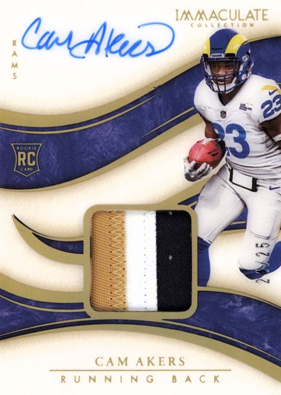 This card is 1 of 25 Cam Akers' card variations in the 2020 Immaculate set being tracked by Sports Card Investor, including Immaculate Numbers Rookie Patch Autographs (/23), Immaculate Rookie Eye Black Jersey Autographs (/99), Immaculate Rookie Shadowbox Signatures (/99), Immaculate Rookie Signature Patches (/99), and Premium Patch Rookie Autographs (/99).
