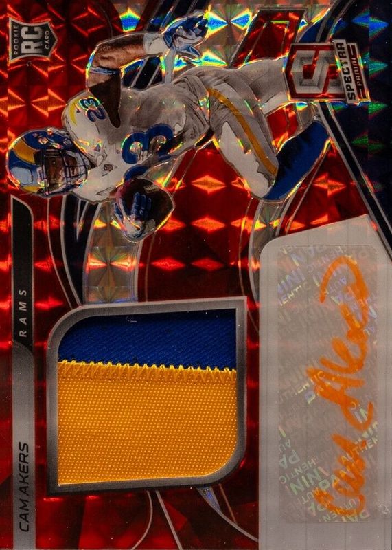 This card is 1 of 16 Cam Akers' card variations in the 2020 Spectra set being tracked by Sports Card Investor, including Rookie Patch Auto /99, Rookie Patch Auto - Hyper /75, Rookie Patch Auto - Neon Blue /60, Rookie Patch Auto - Neon Green /50, and Rookie Patch Auto - Neon Purple /35.