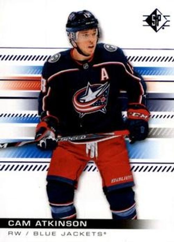The Cam Atkinson 2019 SP #53 Blue card is 1 of 5 Cam Atkinson's card variations in the 2019 SP set being tracked by Sports Card Investor, including Base /1199, Authentic Profiles - Blue, Authentic Profiles Jersey, and Authentic Profiles /649.