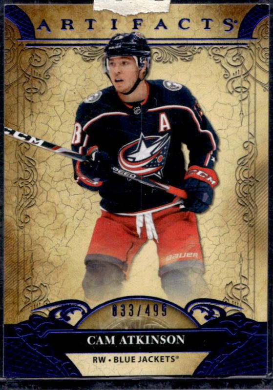 The Cam Atkinson 2020 Upper Deck Artifacts #56 Blue Sapphire /499 card is 1 of 14 Cam Atkinson's card variations in the 2020 Upper Deck Artifacts set being tracked by Sports Card Investor, including Base /999, Copper /299, Emerald /99, Autumn /75, and Aqua /45.