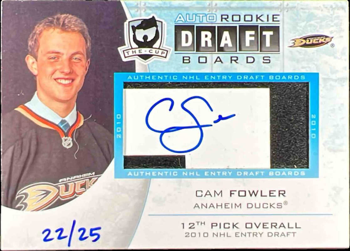 The Cam Fowler 2010 Upper Deck The Cup #DB-CF Auto Draft Boards /25 Rookie card is 1 of 22 Cam Fowler's card variations in the 2010 Upper Deck The Cup set being tracked by Sports Card Investor, including Base /199, Gold /25, Gold Rainbow /25, Black /1, and Limited Logos Autographs /50.