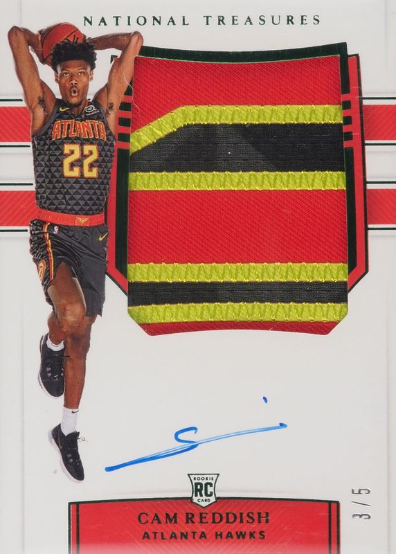 This card is 1 of 8 Cam Reddish's card variations in the 2019 National Treasures set being tracked by Sports Card Investor, including Rookie Patch Auto /99, Rookie Patch Auto - Stars & Stripes /30, Rookie Patch Auto - Gold /10, Rookie Patch Auto - Stars & Stripes Blue /3, and Rookie Patch Auto - Logoman /1.