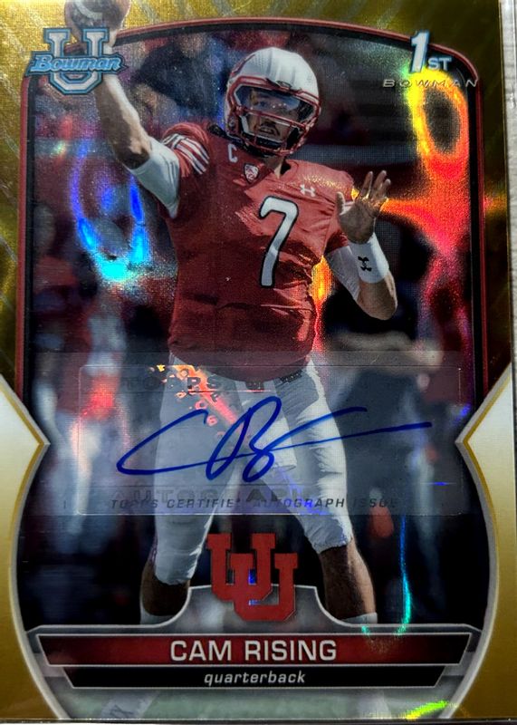 The Cam Rising 2022 Bowman Chrome University #76 Prospect Auto - Gold Lava Refractor /50 (1st) card in Raw condition has not changed in price in the last 30 days and was last sold for $8.50 .