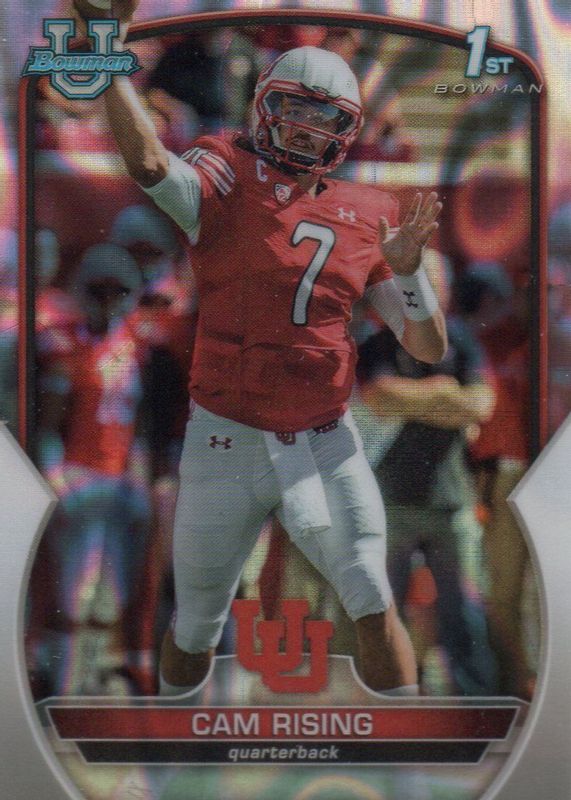This card is 1 of 37 Cam Rising's card variations in the 2022 Bowman Chrome University set being tracked by Sports Card Investor, including Prospects (1st), Prospects - Pink Refractor (1st), Prospects - Purple Shimmer Refractor (1st), Prospects - Refractor (1st), and Prospects - Purple Mini-Diamond Refractor /399 (1st).