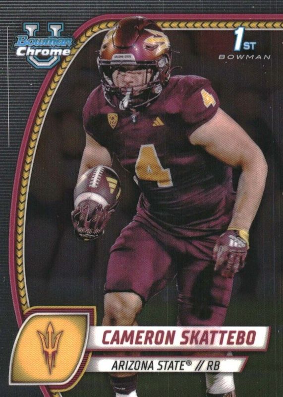The Cam Skattebo 2024 Bowman Chrome University #37 Base (1st) card in Raw condition has moved down -$2.57 (-51.4%) in the last 30 days and was last sold for $2.43 .