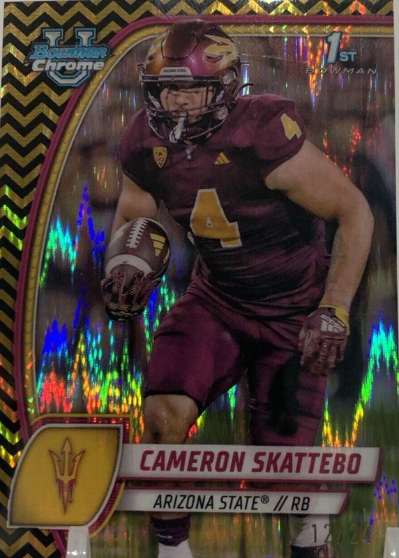 This card is 1 of 43 Cam Skattebo's card variations in the 2024 Bowman Chrome University set being tracked by Sports Card Investor, including Base (1st), Pink Lava Refractor (1st), Purple Shimmer Refractor (1st), Refractor (1st), and Stealth Refractor (1st).
