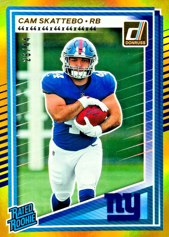 The Cam Skattebo 2025 Donruss #302 Jersey Number (/44) Rookie card in Raw condition has not changed in price in the last 30 days and was last sold for $150.00 .