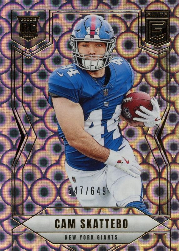 This card is 1 of 37 Cam Skattebo's card variations in the 2025 Elite set being tracked by Sports Card Investor, including Base Rookie /999, Aspirations (/56), Green Disco, Pink, and Status (/44).