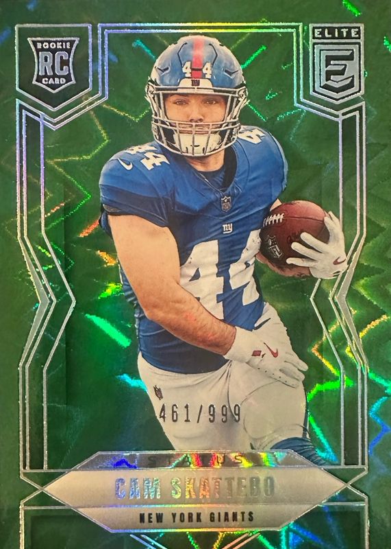 This card is 1 of 37 Cam Skattebo's card variations in the 2025 Elite set being tracked by Sports Card Investor, including Base Rookie /999, Aspirations (/56), Green Disco, Pink, and Status (/44).