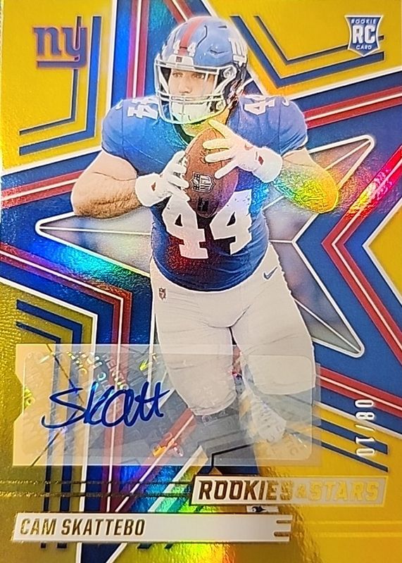 The Cam Skattebo 2025 Rookies & Stars #110 Rookies Signatures - Gold /10 card in Raw condition has not changed in price in the last 30 days and was last sold for $195.00 .