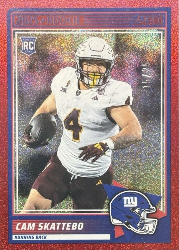The Cam Skattebo 2025 Score #1 Dots Red /25 Rookie card in Raw condition has not changed in price in the last 30 days and was last sold for $87.00 .