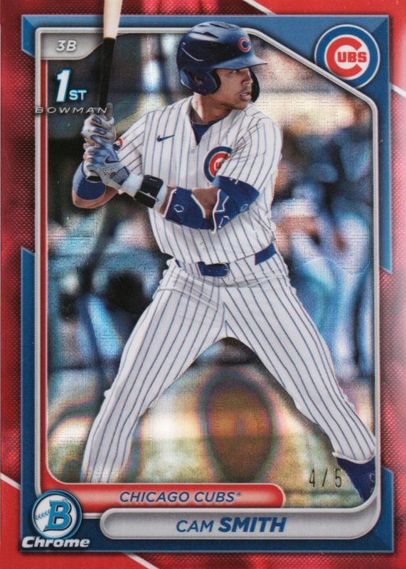 This card is 1 of 50 Cam Smith's card variations in the 2024 Bowman Draft set being tracked by Sports Card Investor, including Chrome (1st), Chrome - Bubble Gum (1st), Chrome - Lunar Glow Refractor (1st), Chrome - Peanuts (1st), and Chrome - Pearl Refractor (1st).