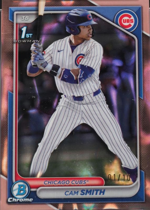 This card is 1 of 50 Cam Smith's card variations in the 2024 Bowman Draft set being tracked by Sports Card Investor, including Chrome (1st), Chrome - Bubble Gum (1st), Chrome - Lunar Glow Refractor (1st), Chrome - Peanuts (1st), and Chrome - Pearl Refractor (1st).