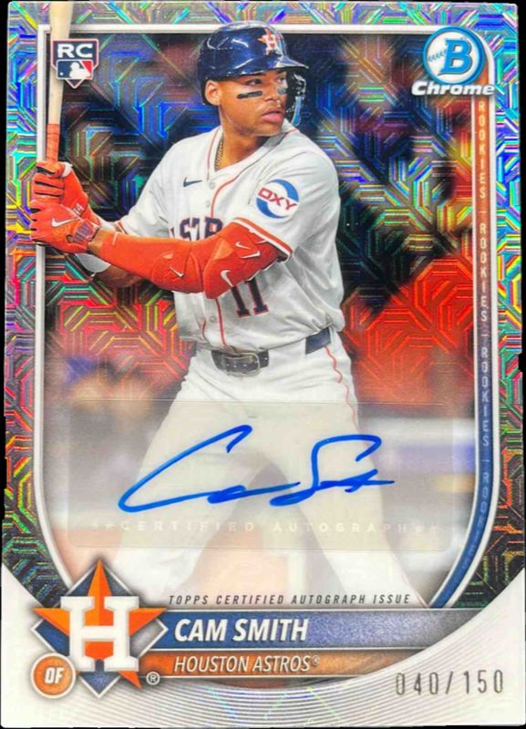 The Cam Smith 2025 Bowman Chrome Mega Box #CRA-CS Mojo Refractor Rookie card is 1 of 28 Cam Smith's card variations in the 2025 Bowman Chrome Mega Box set being tracked by Sports Card Investor, including #77 Mojo Refractor, #MR-21 Mojo Refractor, #77 Aqua Mojo Refractor /299, #77 Purple Mojo Refractor /250, and #MR-21 Purple Mojo Refractor /250.