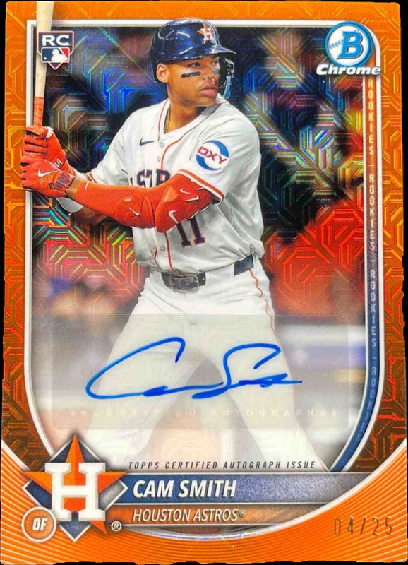The Cam Smith 2025 Bowman Chrome Mega Box #CRA-CS Orange Mojo Refractor /25 Rookie card is 1 of 28 Cam Smith's card variations in the 2025 Bowman Chrome Mega Box set being tracked by Sports Card Investor, including #77 Mojo Refractor, #MR-21 Mojo Refractor, #CRA-CS Mojo Refractor, #77 Aqua Mojo Refractor /299, and #77 Purple Mojo Refractor /250.