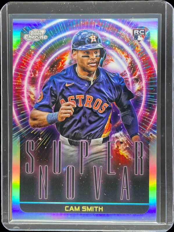 The Cam Smith 2025 Topps Chrome Cosmic #S-25 Supernova Rookie card is 1 of 58 Cam Smith's card variations in the 2025 Topps Chrome Cosmic set being tracked by Sports Card Investor, including Base, Nucleus Refractor, Refractor, Aqua Equinox Refractor /199, and Purple Nebula Refractor /150.