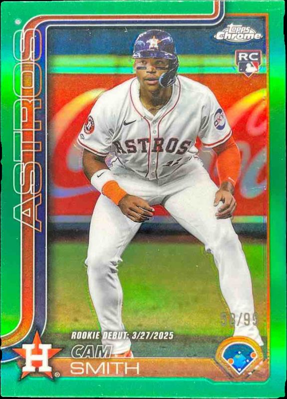 The Cam Smith 2025 Topps Chrome Update #USC19 Green Refractor /99 Rookie card is 1 of 238 Cam Smith's card variations in the 2025 Topps Chrome Update set being tracked by Sports Card Investor, including #USC145 Base, #USC19 Base, #USC145 Image Variation, #USC19 Rookie Debut, and #USC19 Geometric Refractor.