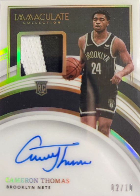 This card is 1 of 10 Cam Thomas' card variations in the 2021 Immaculate set being tracked by Sports Card Investor, including Premium Patch Autographs (/50), Premium Patch Autographs - Gold (/10), Premium Patch Autographs - Red (/25), Rookie Patch Auto - Jersey Number (/24), and Rookie Patch Auto /99.
