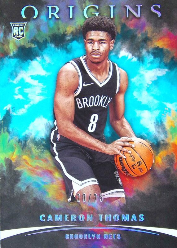 The Cam Thomas 2021 Origins #77 Turquoise /25 Rookie card in Raw condition has not changed in price in the last 30 days and was last sold for $13.05 .