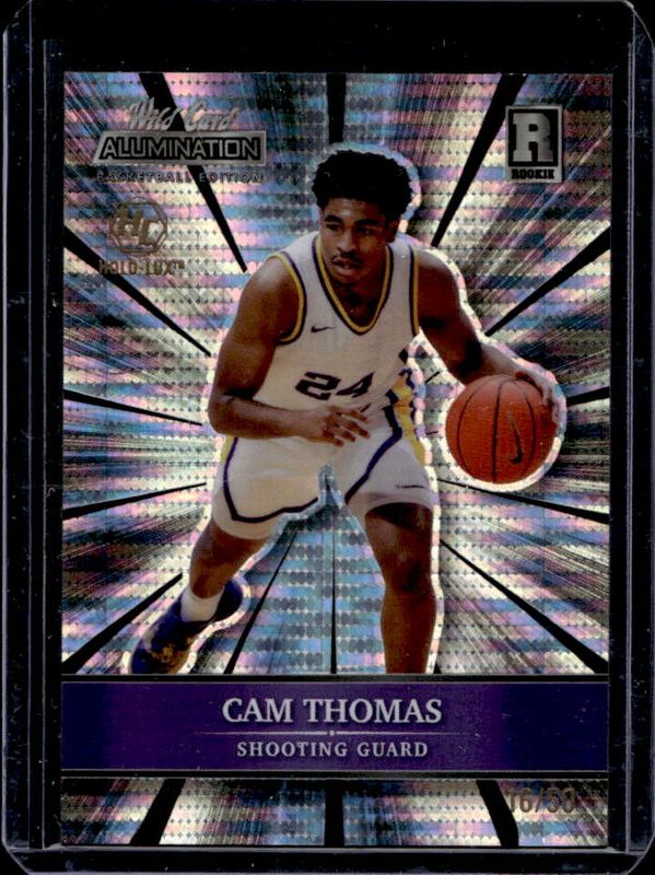 The Cam Thomas 2021 Wild Card Alumination #ABC-13 Holo Lux Silver Sparkles Paper /50 Rookie card is 1 of 238 Cam Thomas' card variations in the 2021 Wild Card Alumination set being tracked by Sports Card Investor, including Base, 100 Stripe, 10 Stripe, 20 Stripe, and 50 Stripe.