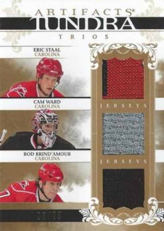 The Cam Ward / Eric Staal / Rod Brind Amour 2009 Upper Deck Artifacts #TRI-BSW Tundra Trios /75 card is 1 of 2 Cam Ward / Eric Staal / Rod Brind Amour's card variations in the 2009 Upper Deck Artifacts set being tracked by Sports Card Investor, including Tundra Trios Patches /10.