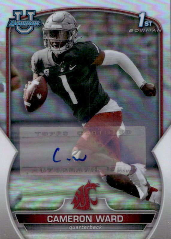 The Cam Ward 2022 Bowman Chrome University #34 Prospect Auto - Refractor /499 (1st) card in Raw condition has moved down -$13.74 (-21.6%) in the last 30 days and was last sold for $50.00 .