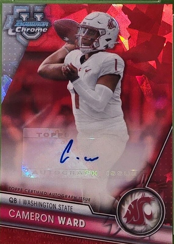 The Cam Ward 2023 Bowman Chrome University Sapphire Edition #PA-CWA Prospect Auto - Red /5 card in Raw condition has not changed in price in the last 30 days and was last sold for $192.16 .