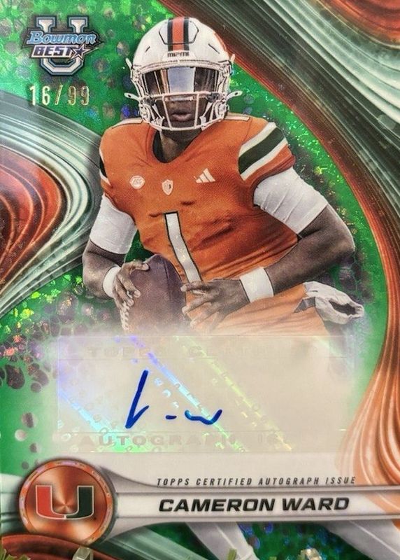 Best Prices Available For Sale of Cam Ward 2024 Bowman Best University #BOA-CWA Best of 2024 Autographs - Green Mini-Diamond Refractor /99