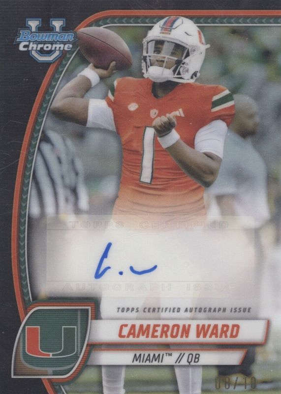 This card is 1 of 14 Cam Ward's card variations in the 2024 Bowman Chrome University set being tracked by Sports Card Investor, including Prospect Auto, Prospect Auto - Stealth Refractor, Prospect Auto - Refractor /299, Prospect Auto - Fuchsia Refractor /150, and Prospect Auto - Green Refractor /99.