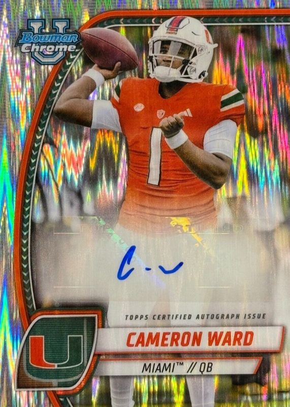This card is 1 of 14 Cam Ward's card variations in the 2024 Bowman Chrome University set being tracked by Sports Card Investor, including Prospect Auto, Prospect Auto - Refractor /299, Prospect Auto - Fuchsia Refractor /150, Prospect Auto - Green Refractor /99, and Prospect Auto - Yellow Refractor /75.