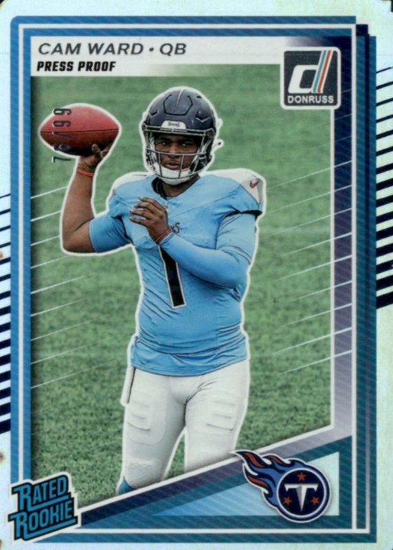 The Cam Ward 2025 Donruss #350 Press Proof Silver Die-Cut /99 Rookie card in Raw condition has not changed in price in the last 30 days and was last sold for $13.50 .