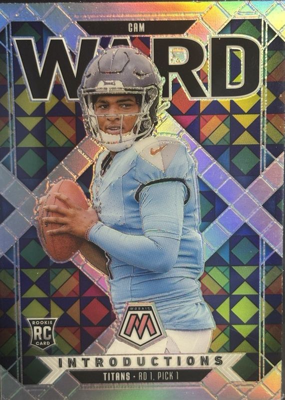 The Cam Ward 2025 Mosaic #6 Introductions - Silver Rookie card in Raw condition has moved down -$2.24 (-44.9%) in the last 30 days and was last sold for $2.75 .
