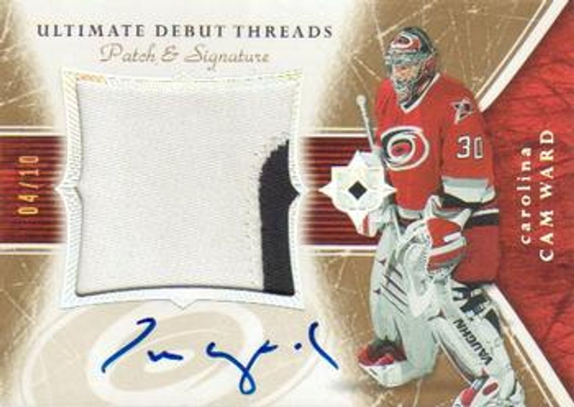 The Cam Ward (NHL) 2005 Upper Deck Ultimate Collection #DAP-CW Ultimate Debut Threads Patches Autographs /10 Rookie card is 1 of 11 Cam Ward (NHL)'s card variations in the 2005 Upper Deck Ultimate Collection set being tracked by Sports Card Investor, including Base /599, Ultimate Signatures, Ultimate Debut Threads Jerseys /250, Premium Swatches /75, and Ultimate Debut Threads Patches /60.