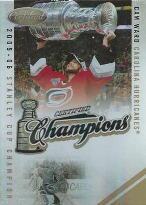 The Cam Ward (NHL) 2010 Certified #15 Champions - Mirror Gold /25 card is 1 of 35 Cam Ward (NHL)'s card variations in the 2010 Certified set being tracked by Sports Card Investor, including Base /799, Platinum Red /999, Platinum Blue /250, Mirror Red /100, and Mirror Blue /50.