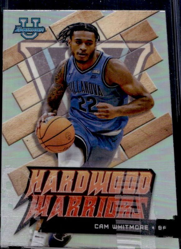 The Cam Whitmore 2022 Bowman Best University #HW-1 Hardwood Warriors card is 1 of 65 Cam Whitmore's card variations in the 2022 Bowman Best University set being tracked by Sports Card Investor, including Base, Refractor, Speckle Refractor, Mini-Diamond Refractor /299, and Purple Refractor /250.