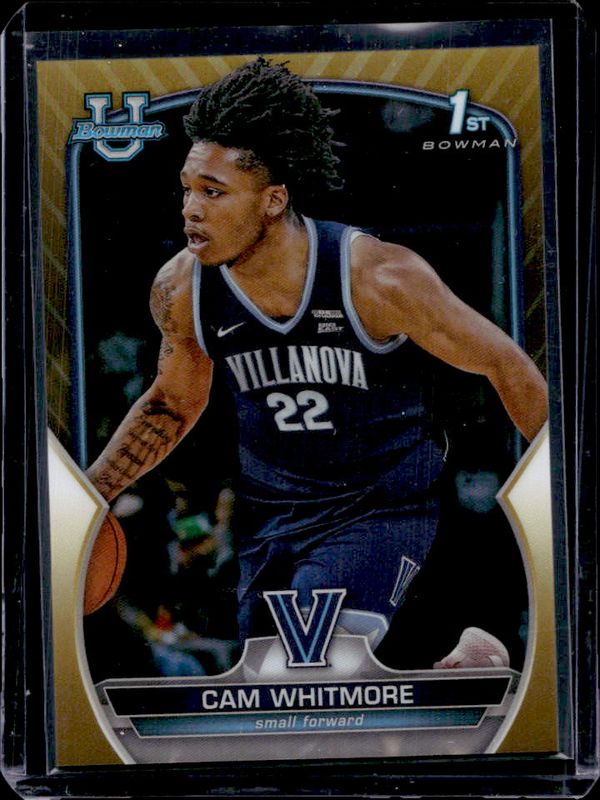 The Cam Whitmore 2022 Bowman Chrome University #22 Gold Refractor /50 card is 1 of 68 Cam Whitmore's card variations in the 2022 Bowman Chrome University set being tracked by Sports Card Investor, including Base, Pink Refractor, Purple Shimmer Refractor, Refractor, and Shimmer Refractor.